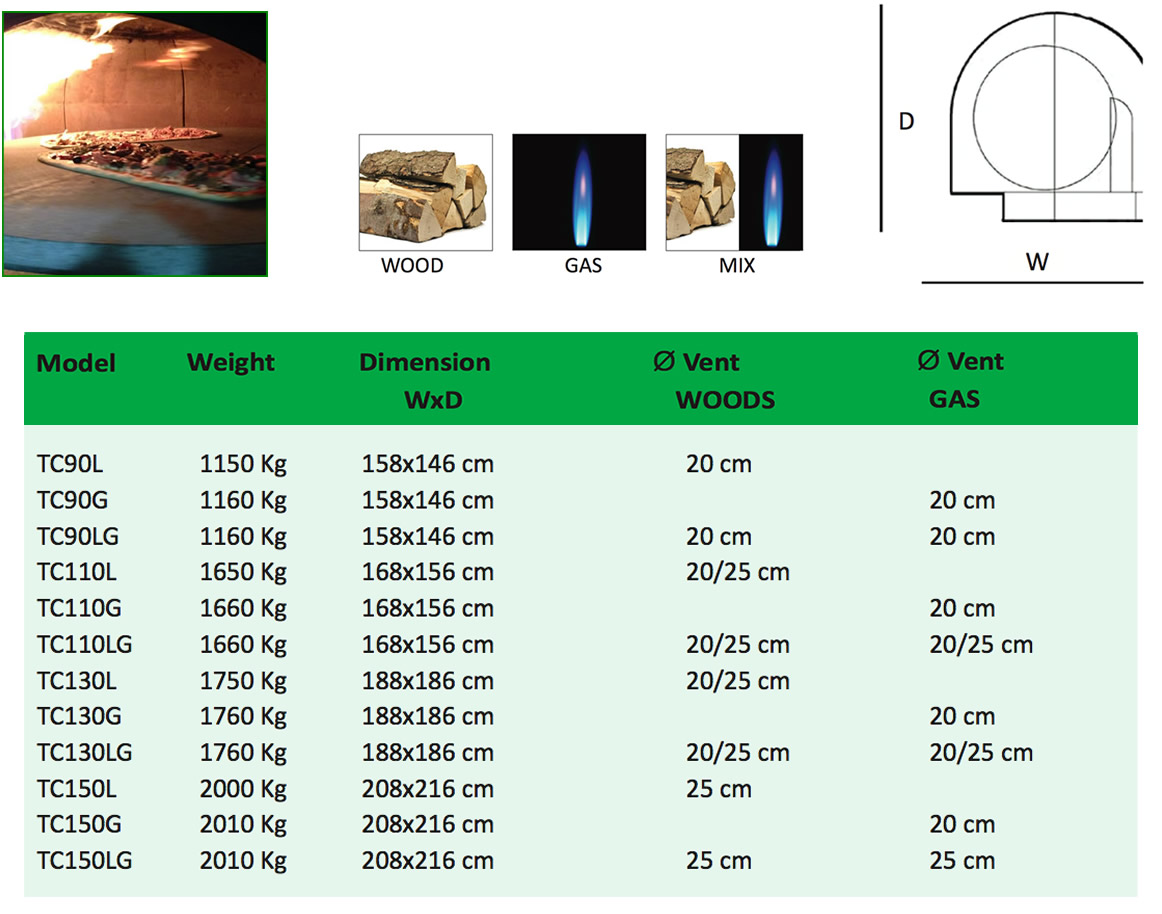 The different types of our ovens can be fueled by wood, by gas or combined gas and wood, with different dimensions of the plate: